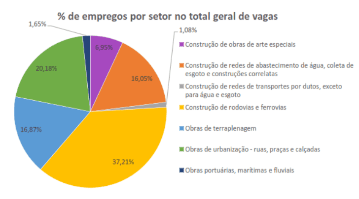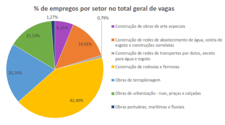 Mesmo com a grande perda de empregos, o segmento de “construção de Rodovias e Ferrovias” foi o que apresentou, em dezembro, a maior quantidade de mão de obra alocada, com 37,21% do total. Na sequência, estava o segmento de “obras de urbanização – ruas praças e calçadas”,  com 20,18% do total da força de trabalho. O total de trabalhadores ativos no mês de dezembro foi de 112.784.