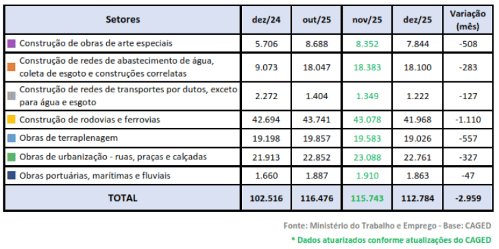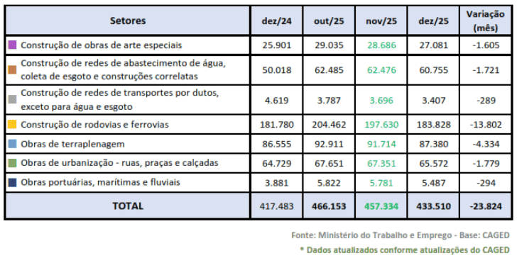 Em nível nacional, o percentual de vagas ainda ocupadas no setor de “construção de Rodovias e Ferrovias”  (42,4%) superou, em dezembro, todos os demais segmentos que compõe o nível de emprego. Em segundo lugar ficou o segmento ”obras de terraplenagem” com 20,16% do total de vagas. Em todo o país, o total de trabalhadores ativos no mês de dezembro de 2025 foi de 433.510.